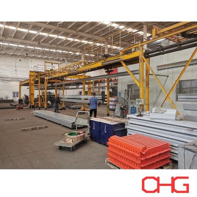 Material handling is achieved through an overhead conveyor system, providing smooth, stable, and continuous transport of workpieces throughout the process.